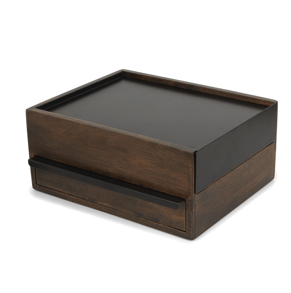Большая шкатулка для украшений с потайным отделением — строгая и стильная благодаря необычной конструкции и благородному сочетанию натурального дерева и металла. Верхняя часть с разделителями для колец или запонок и небольшими ящичками предназначена для хранения мелких аксессуаров, нижняя — для более крупных: часов, браслетов или колье.