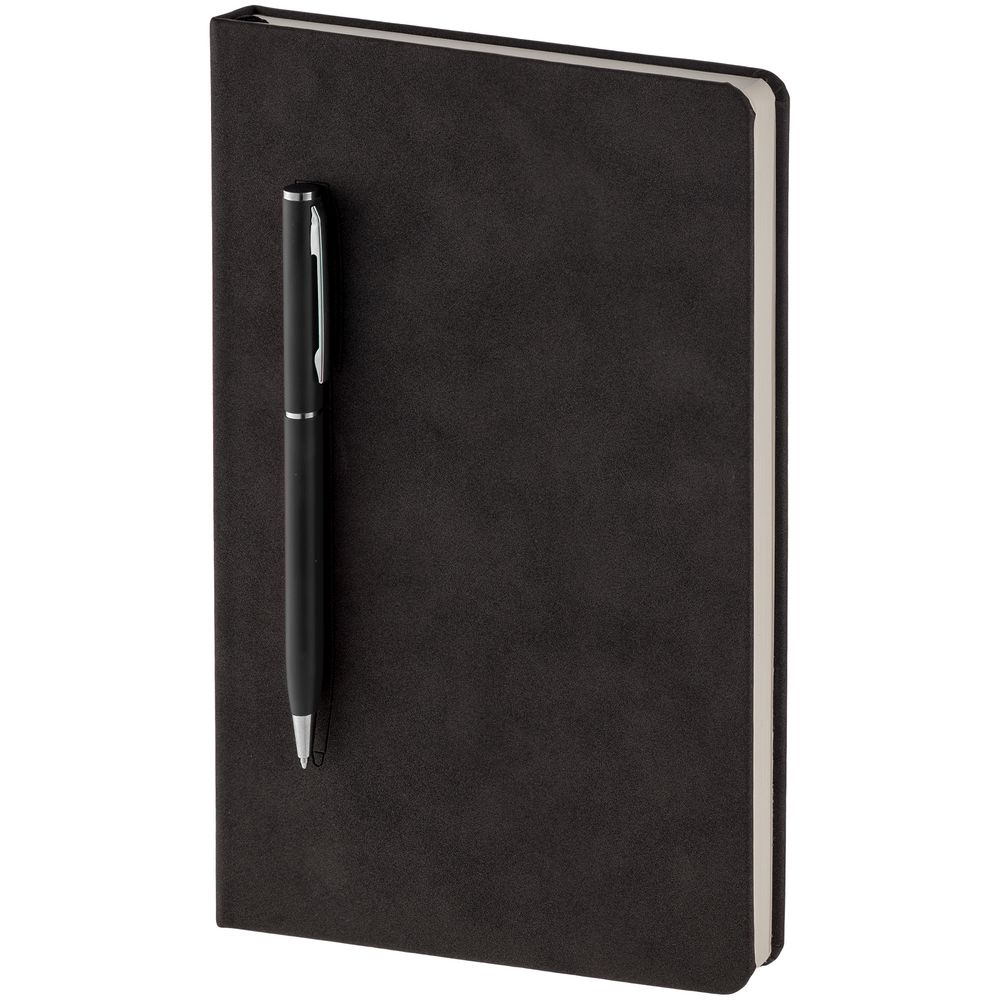 Блокнот в твердой обложке, выполненной из материала Nubuck, черный, дополнен цветным ляссе и магнитом, удерживающим ручку.