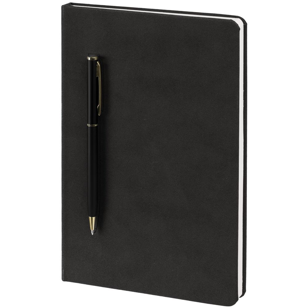 Блокнот в твердой обложке, выполненной из материала Nubuck, черный, дополнен цветным ляссе и магнитом, удерживающим ручку.