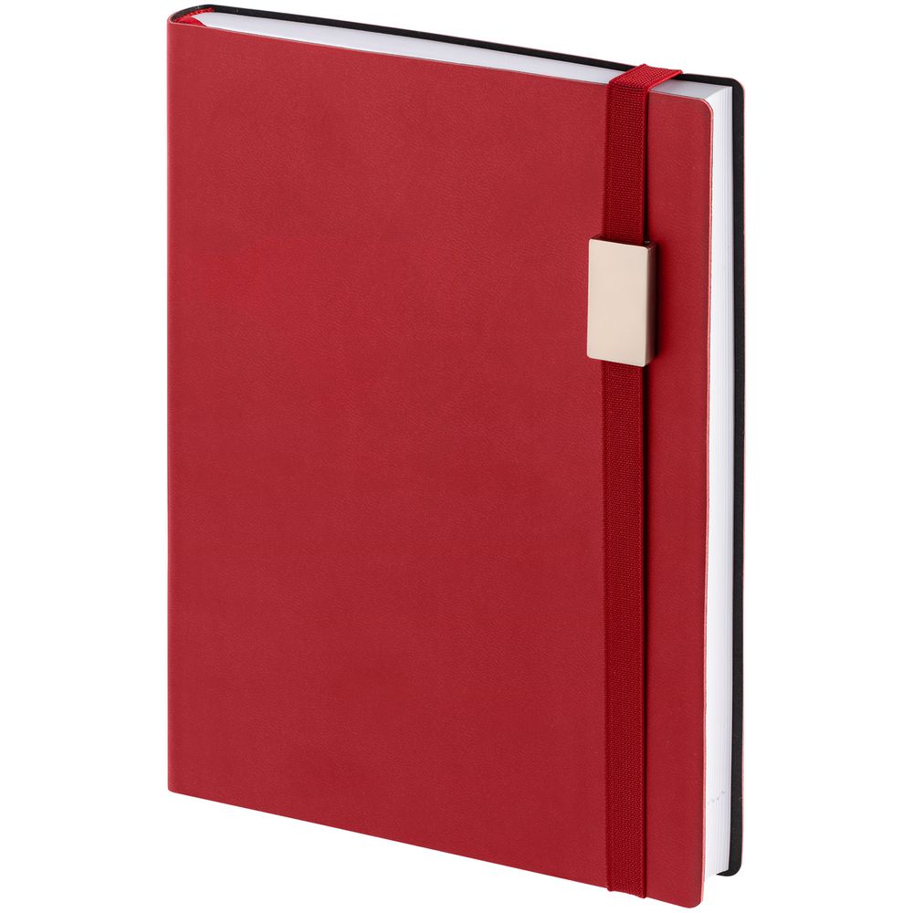 Ежедневник с гибкой обложкой выполнен из материала Brand, красный РР, и дополнен резинкой шириной 1 см с металлическим шильдом, капталом и ляссе красного цвета.