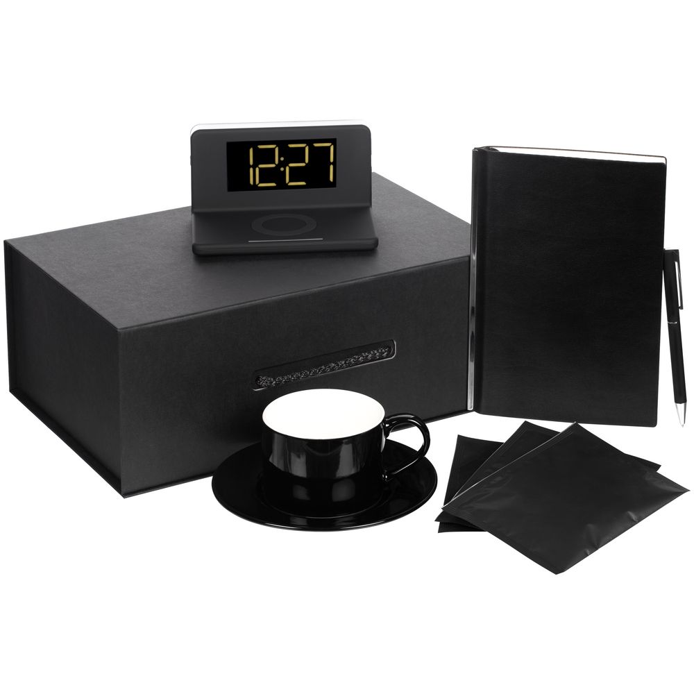 Материал: часы - пластик; ежедневник - искусственная кожа; ручка - пластик, покрытие софт-тач; чайная пара - фарфор; коробка - переплетный картон