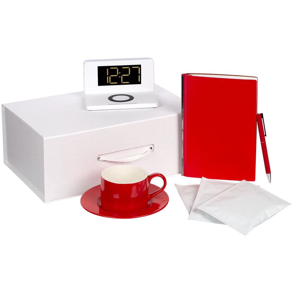 Материал: часы - пластик; ежедневник - искусственная кожа; ручка - пластик, покрытие софт-тач; чайная пара - фарфор; коробка - переплетный картон