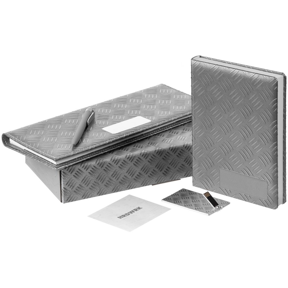 Материал: блокнот - искусственная кожа; флешка - металл; ручка - пластик; коробка - микрогофрокартон, плотность 210 г/м²; полноцветный лайнер