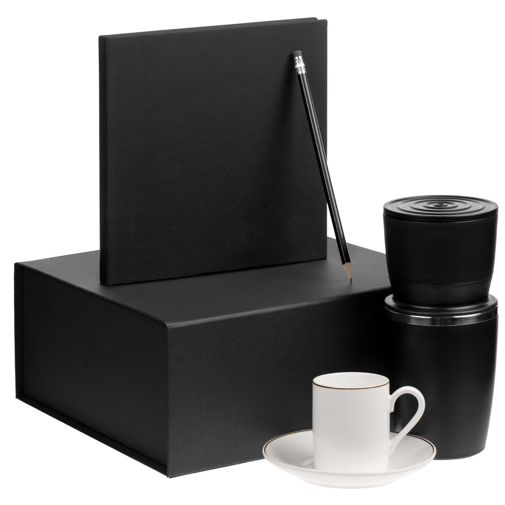 Материал: кофеварка - пластик, нержавеющая сталь, силикон; кофейная пара - фарфор; скетчбук - искусственная кожа; карандаш - дерево