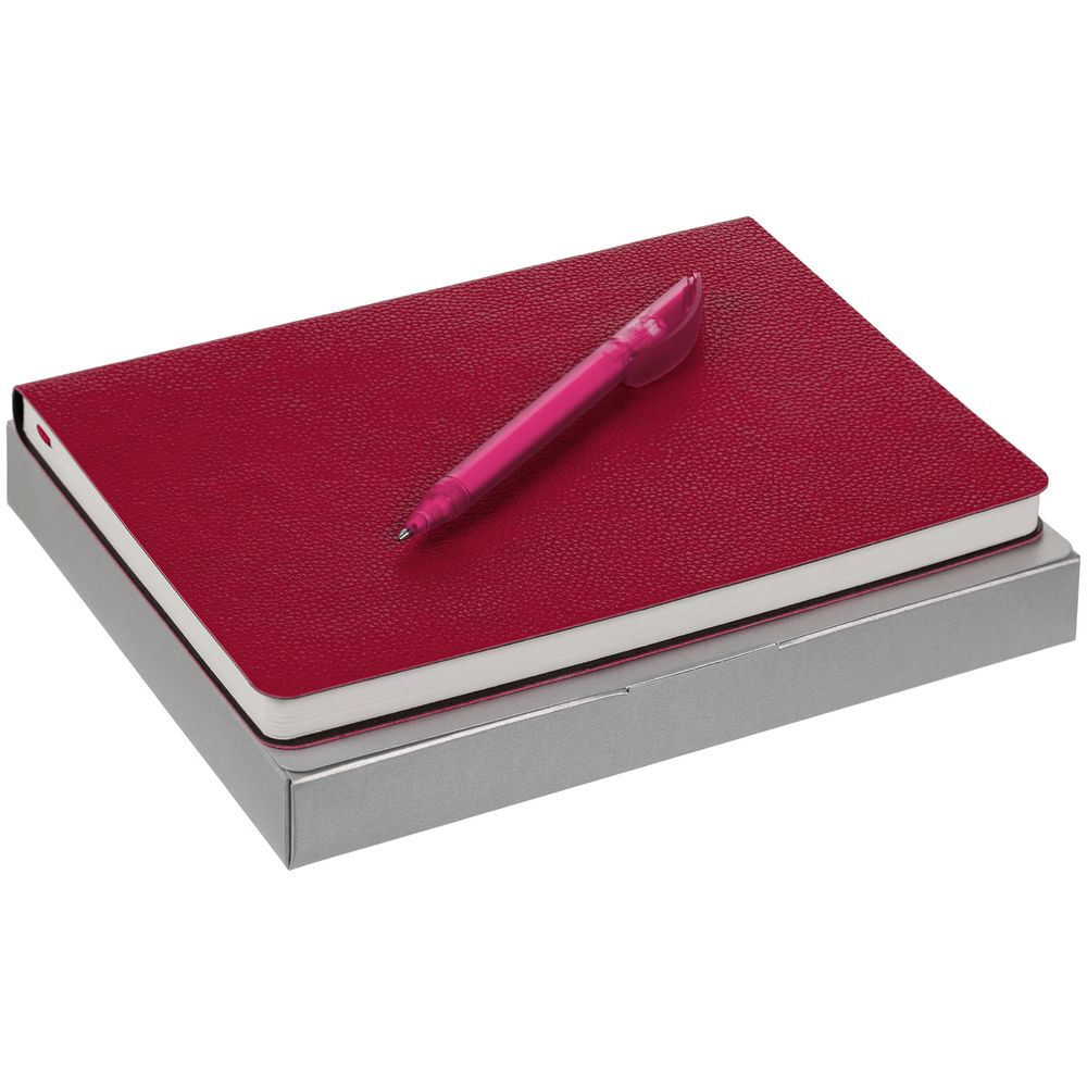 Недатированный ежедневник с гибкой обложкой из фактурного материала La Fite и металлическим шильдом на ляссе и ручка в тон, упакованный в подарочную коробку из дизайнерского картона.