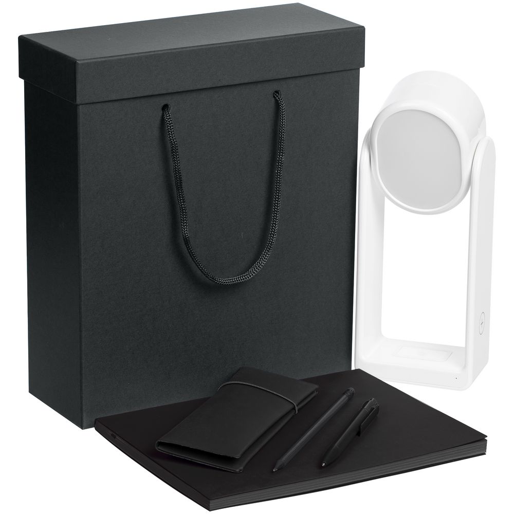 Материал: лампа - пластик; пенал - искусственная кожа, покрытие софт-тач; ежедневник - покрытие софт-тач; ручка - пластик; карандаш - дерево; коробка - переплетный картон