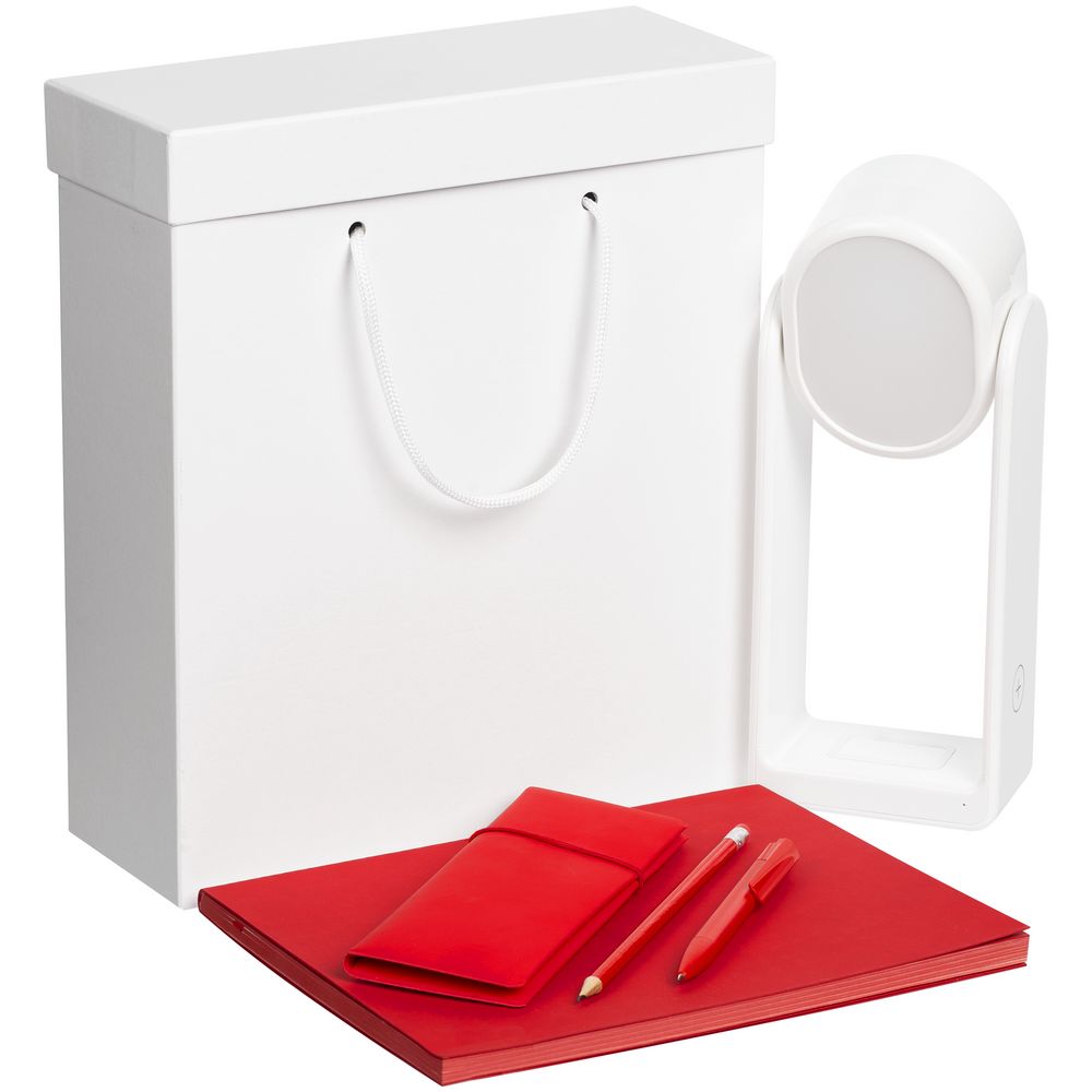 Материал: лампа - пластик; пенал - искусственная кожа, покрытие софт-тач; ежедневник - покрытие софт-тач; ручка - пластик; карандаш - дерево; коробка - переплетный картон
