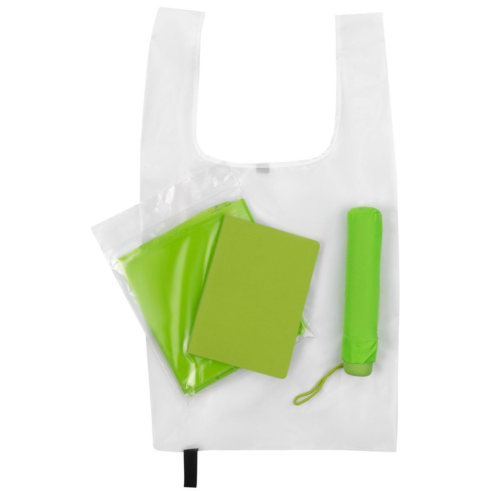 Размер: сумка: 37х42 см; ежедневник: 15х21 см; дождевик: 105х85 см; зонт: 56х96 см