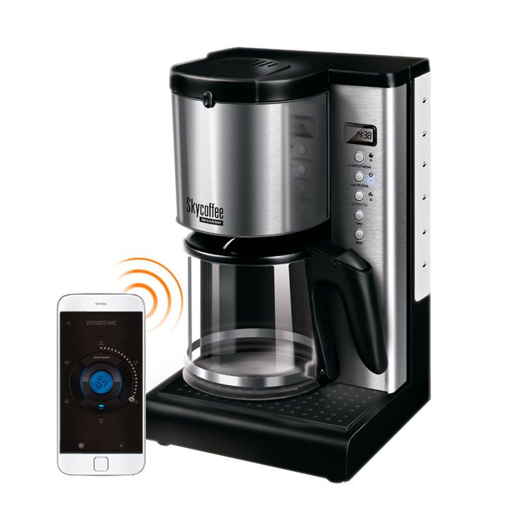 Smart-кофеварка отличается стильным дизайном и компактными размерами. Корпус прибора изготовлен из высококачественного пластика с элементами из нержавеющей стали, а кувшин для готового напитка — из термостойкого стекла.