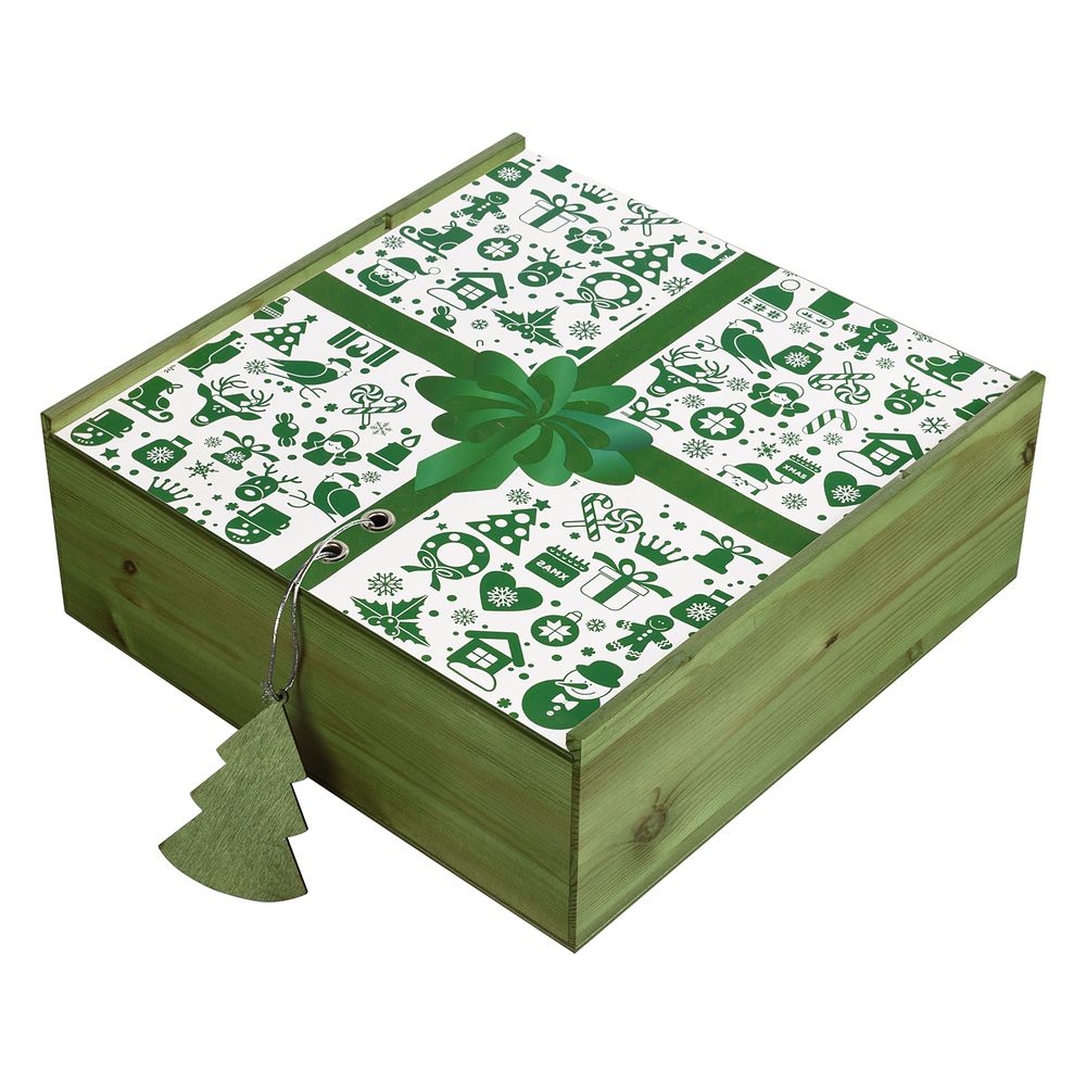 Материал: коробка - дерево, крышка оклеена бумагой; елочка - дерево