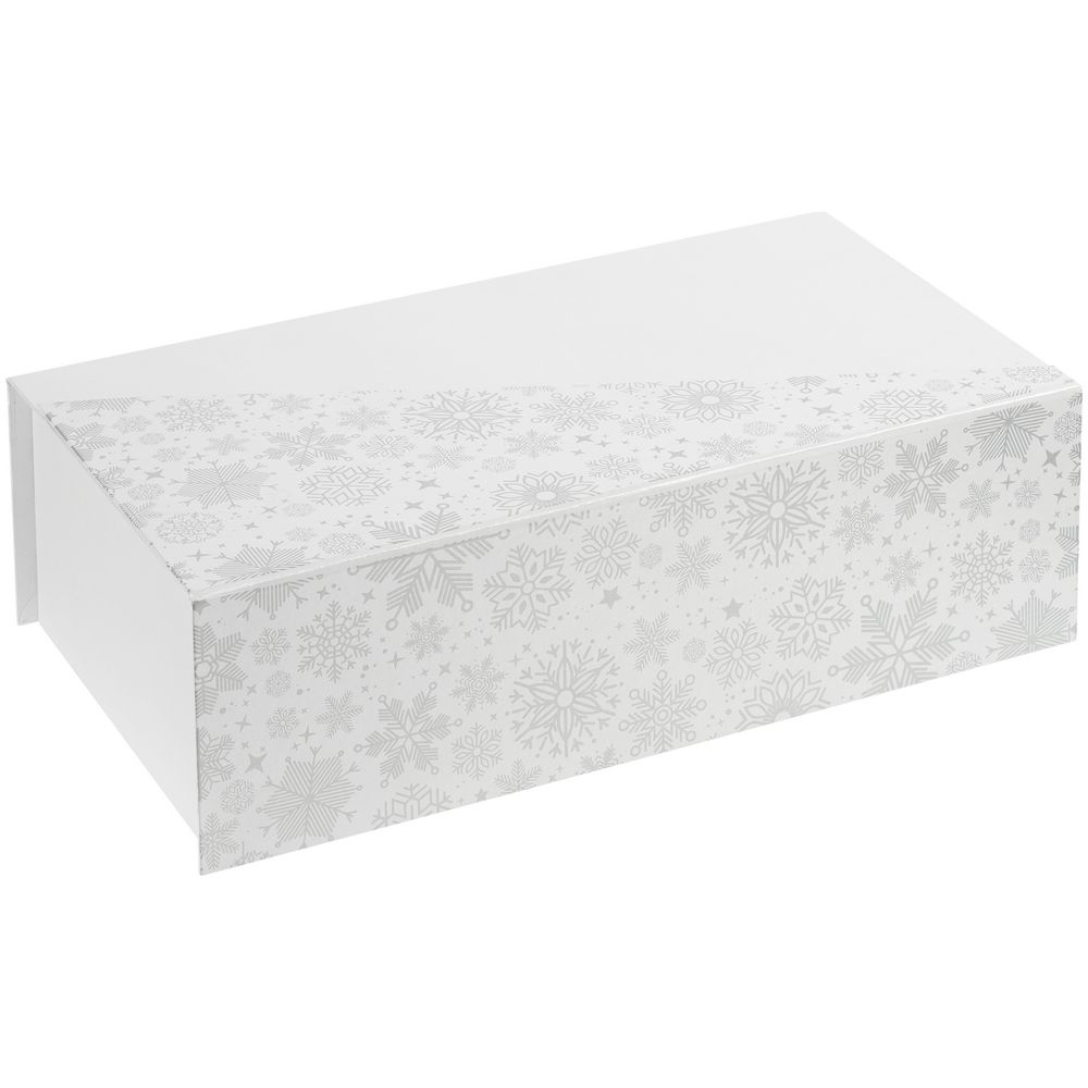 Коробка из переплетного картона, кашированного дизайнерской бумагой Majestic Marble White 120 г/м², с крышкой на магнитах. Снежинки выполнены методом шелкографии.