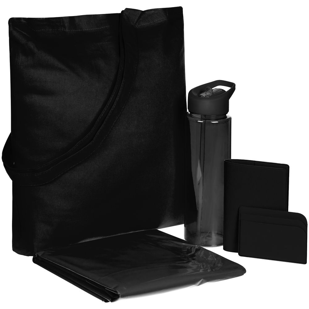 Материал: обложка для паспорта, чехол для карточек - искусственная кожа; сумка - хлопок 100%, плотность 105 г/м²; дождевик - полиэтилен; бутылка - пластик