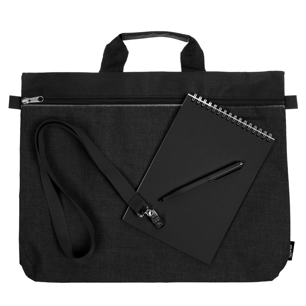 Материал: сумка - полиэстер; блокнот - картон, бумага; лента для бейджа - нейлон; ручка - пластик, металл
