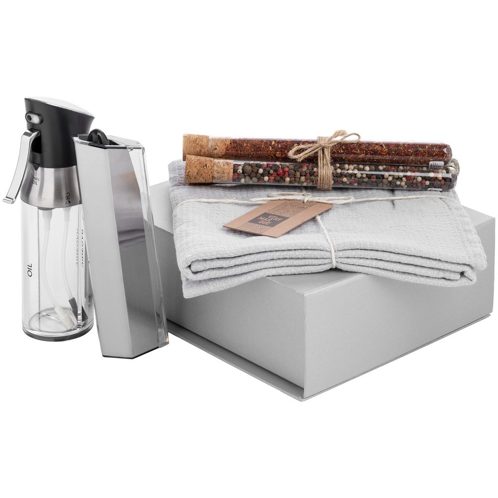 Материал: мельница, дозатор - нержавеющая сталь, пластик; набор полотенец - лен, 73%, хлопок 27%; набор специй - стекло, пробка