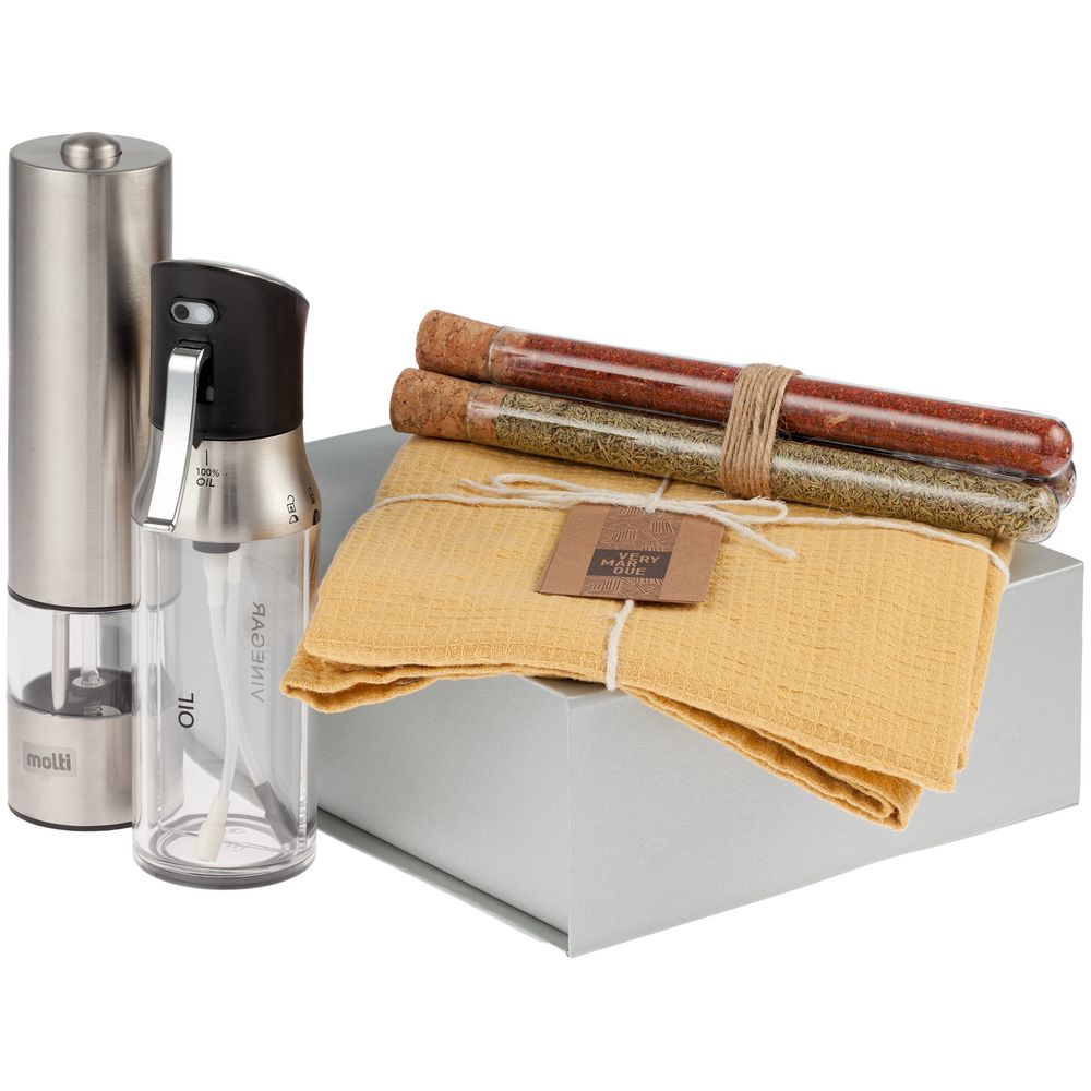Материал: мельница, дозатор - нержавеющая сталь; специи - стекло; набор полотенец - лен, 73%, хлопок 27%