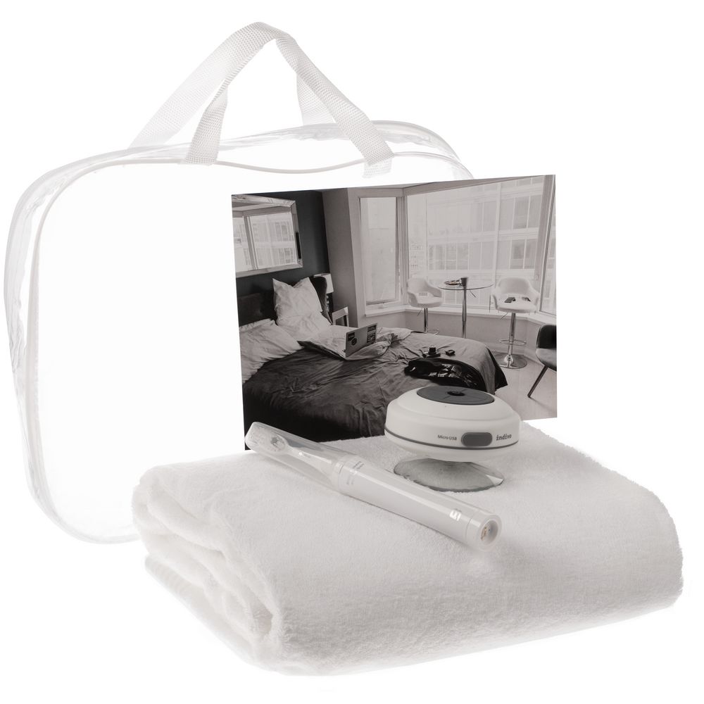 Размер: сумка: 35х27х6 см; полотенце: 80x150 см; зубная щетка 21х2,5 см; колонка: 9x9x5,5 см