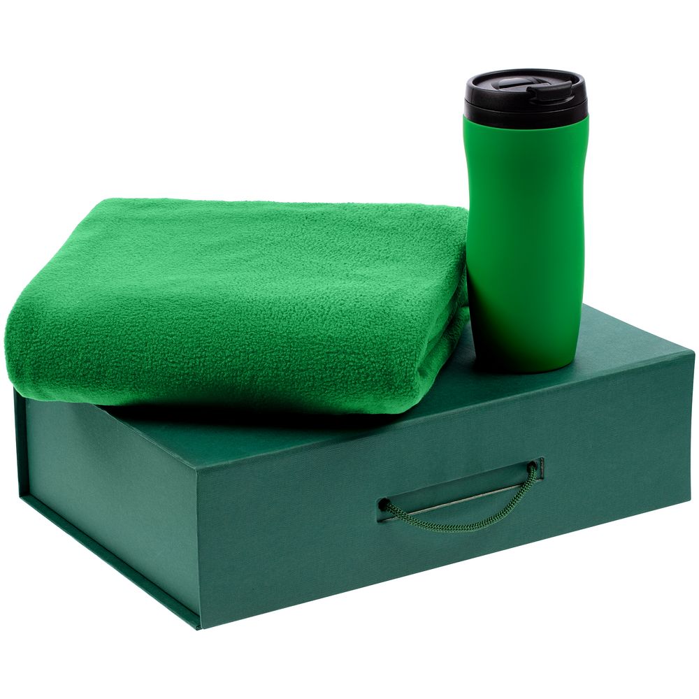 Материал: термостакан - пластик, крышка, внутренняя колба; нержавеющая сталь, корпус; покрытие софт-тач; плед - флис, плотность 180 г/м²; коробка - переплетный картон; наполнитель - бумага