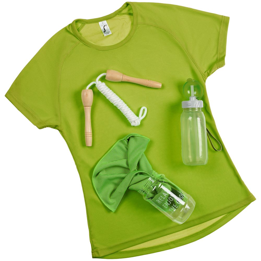 Размер: футболка: XS–XXL; бутылка: диаметр 6,7 см; высота 18,3 см; полотенце: полотенце 80х30 см; скакалка: ручка: 15 см; веревка: 220 см; коробка: 20х20х10,5 см