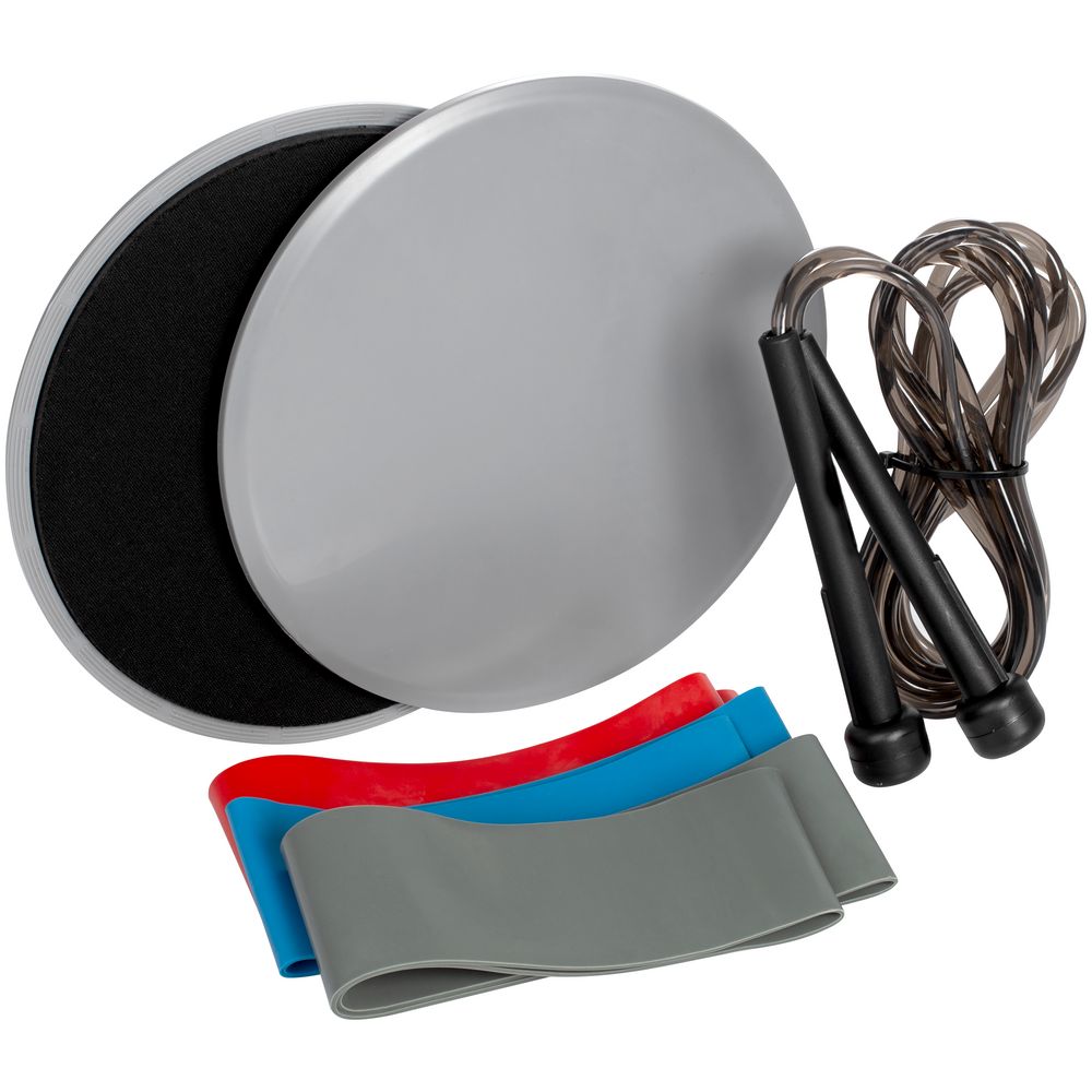 Размер: фитнес-диски: диаметр 17,5, высота 1,2 см; скакалка: шнур 0,5х245 см; ленты: 31х5 см, мешочек для лент: 15х22 см