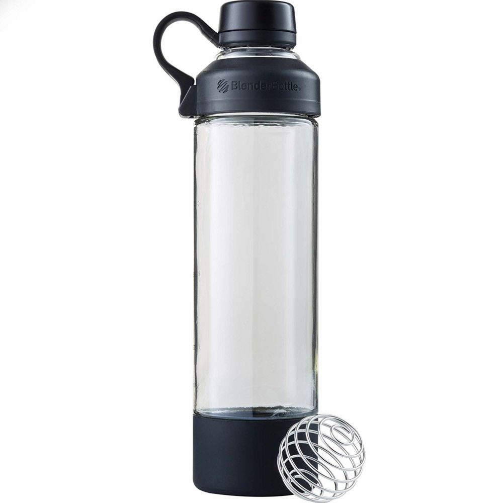 Стеклянная бутылка-шейкер Mantra поможет сохранить водный баланс во время тренировки и позволит приготовить протеиновый коктейль сразу после нее.