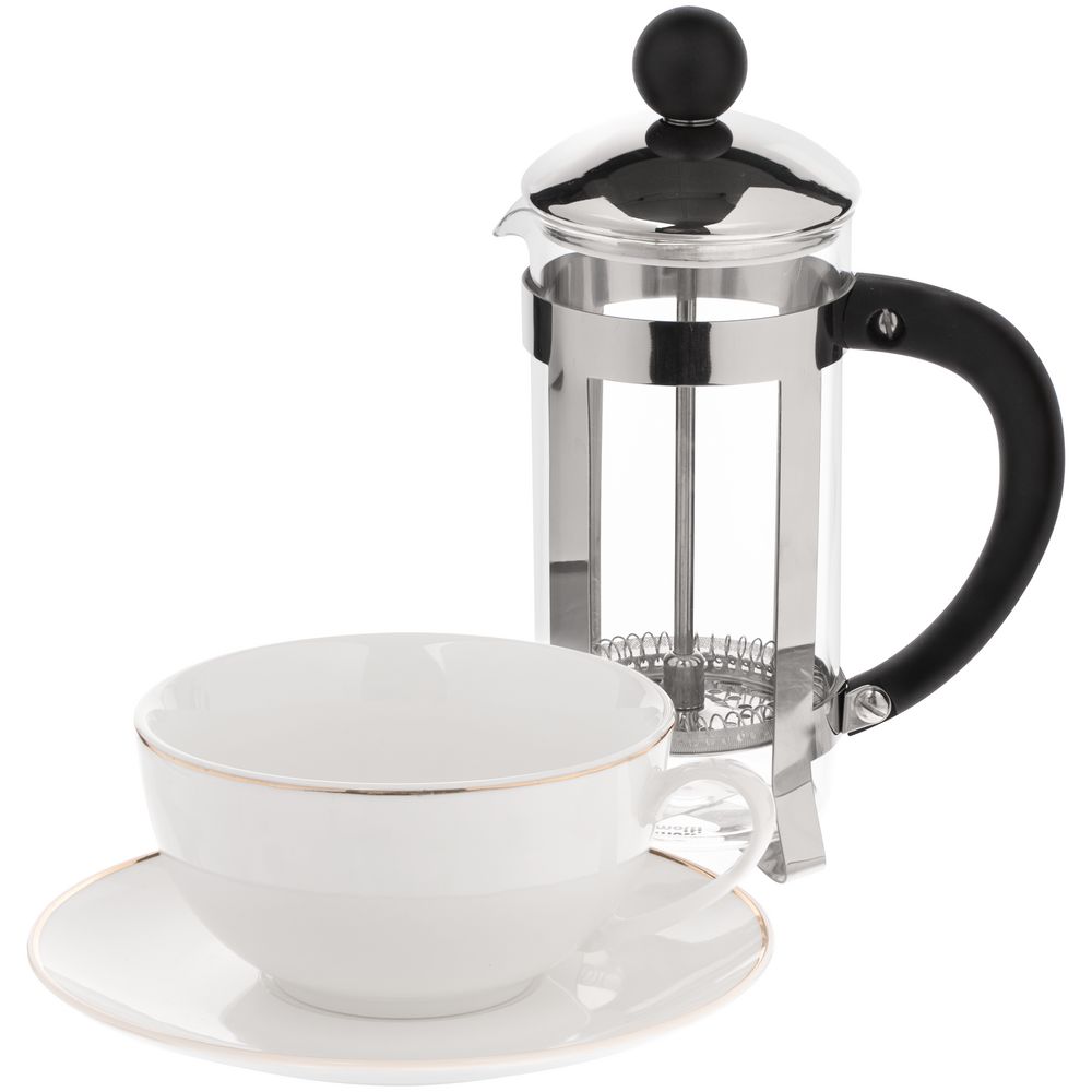 Размер: блюдце: диаметр 15 см, чашка: диаметр 10,5 см, высота 6 см; френч-пресс: высота 19 см, диаметр 7 см, ширина с ручкой 11,5 см; пакет: 24x14x28 см