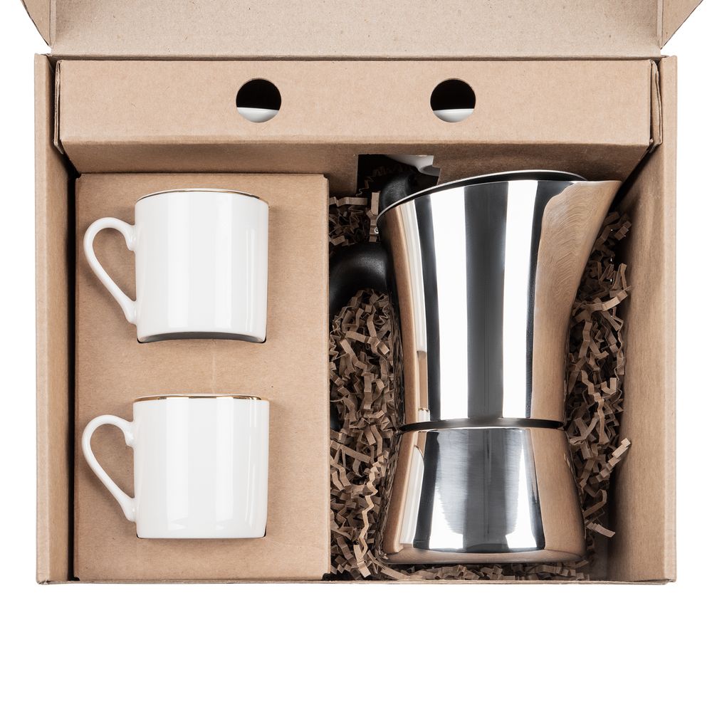 Материал: кофейные пары - фарфор; кофеварка - нержавеющая сталь; коробка, ложемент - микрогофрокартон