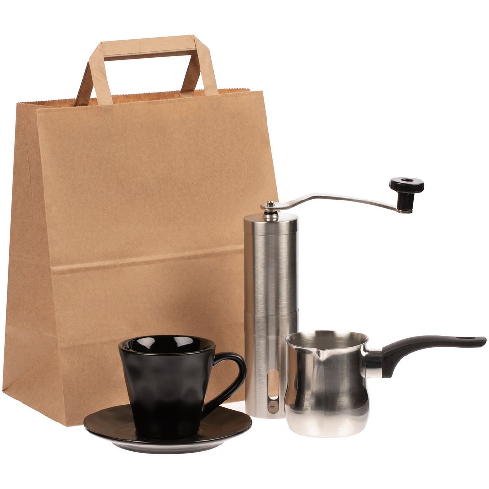 Размер: блюдце: диаметр 14,5 см; чашка: диаметр 8,4 см, высота 8 см; кофемолка: высота 21 см, диаметр 4,7 см, ширина с ручкой 17 см; турка: высота 7,5 см, диаметр 7,5 см, ширина с ручкой 17,5 см; пакет 24x14x28 см