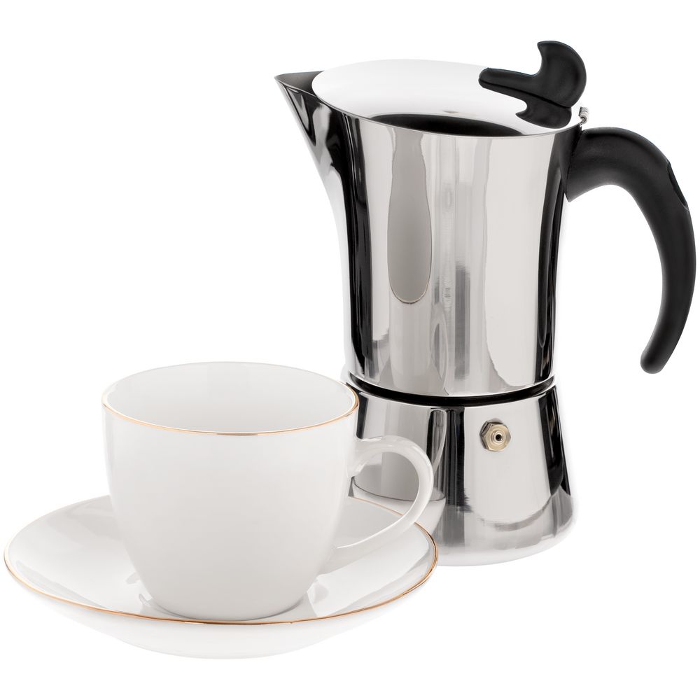 Размер: блюдце: диаметр 14,3 см, высота 2,3 см; чашка: диаметр 8,4 см, высота 7 см; кофеварка: высота 17,3 см, диаметр 9 см, ширина с ручкой 15 см; пакет: 35x35x16 см