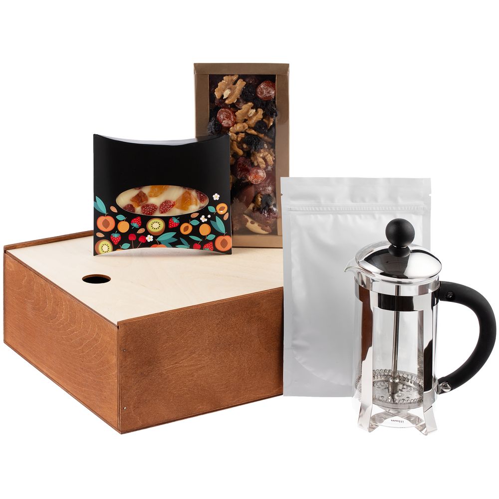 VivaCity — набор для идеального перерыва на кофе. Френч-пресс для заваривания, молотый бразильский кофе, белый шоколад ручной работы с кусочками сушеного персика и клубники, а также ассорти орехов и цукатов станут приятным и оригинальным подарком для любого человека, неравнодушного к кофе и сладостям.