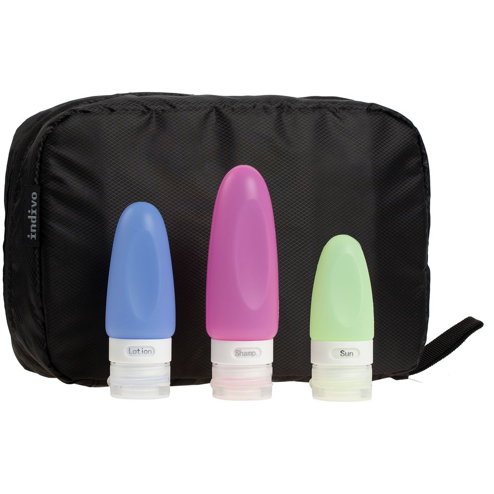 Три емкости для косметики в комплекте: 37 мл, 60 мл, 87 мл. На каждой емкости есть маркировки для обозначения содержимого: шампунь (Shamp.), мыло (Soap), лосьон для тела (Lotion), кондиционер (Cond.), солнцезащитное средство (Sun) и пустое поле для вашей собственной подписи.
