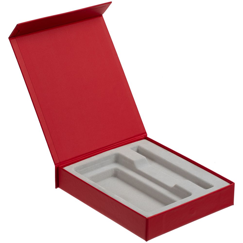 Подарочная коробка для аккумулятора 14,6х7,5х1,3 см и ручки 14,5х1,5х0,8 см с крышкой на магните и флокированным ложементом. Коробка выполнена из переплетного картона, кашированного дизайнерской софт тач бумагой Curious skin.