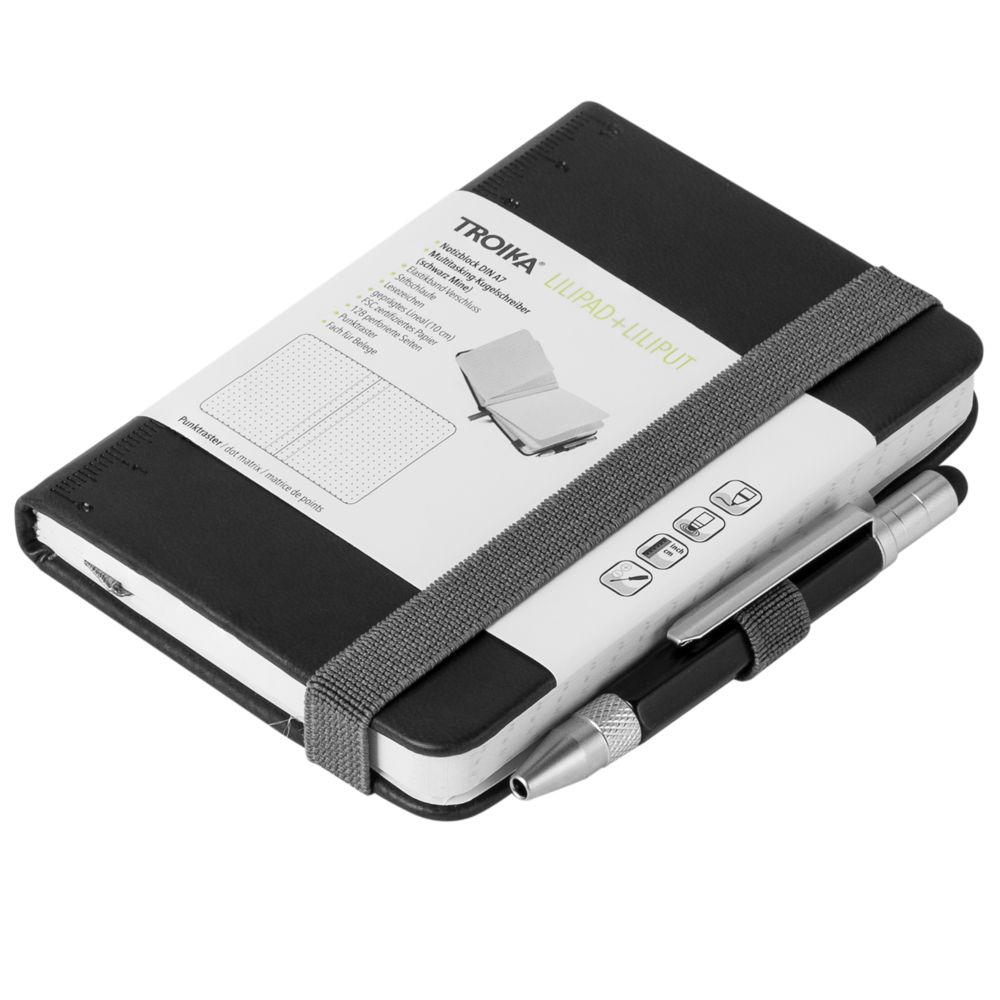 Мини-блокнот с небольшой шариковой ручкой и тисненой 10-сантиметровой линейкой на обложке.