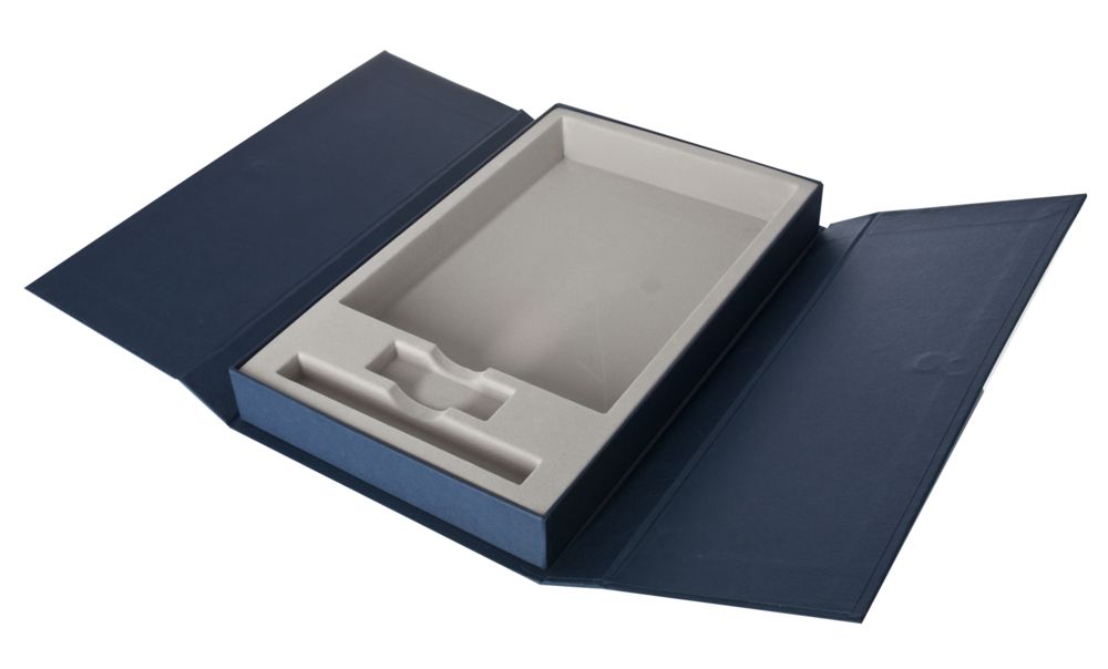 Коробка из переплетного картона 1,75 мм, кашированного бумагой Efalin «Тонкий лен», с двумя створками на магните и флокированным ложементом. Ложемент под ежедневник 15х21х2,3 см, флешку 6,9х2,4 см и ручку 13,8х1,5 см.