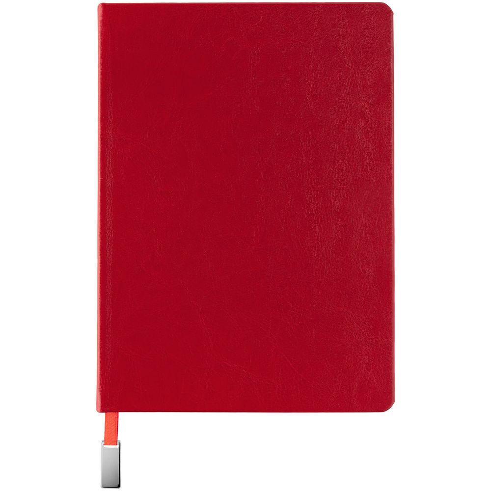 Ежедневник с твердой обложкой, выполнен из материала Nebraska, красный РР, дополнен ляссе в цвет обложки с металлическим шильдом. Блок без календарной сетки: