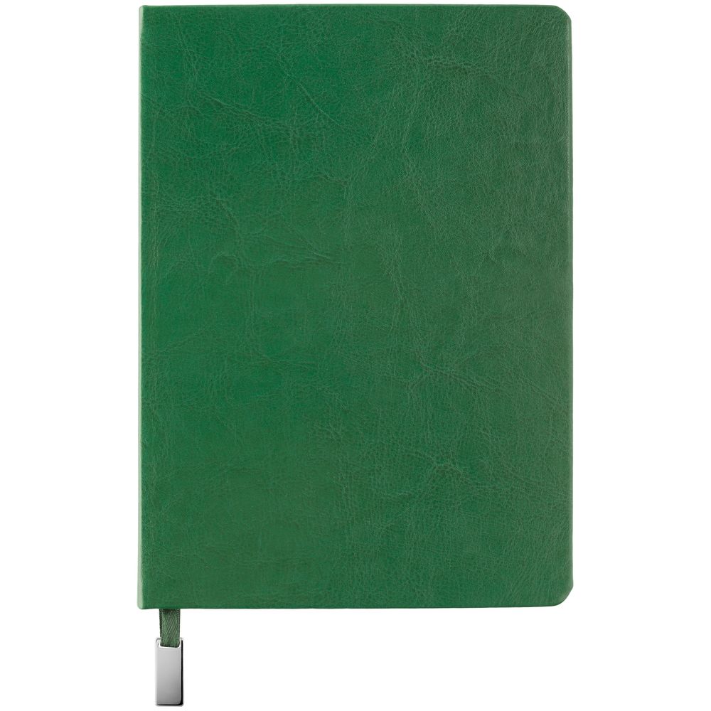 Ежедневник с твердой обложкой, выполнен из материала Nebraska, зеленый FF, дополнен ляссе в цвет обложки с металлическим шильдом. Блок 986, без календарной сетки: