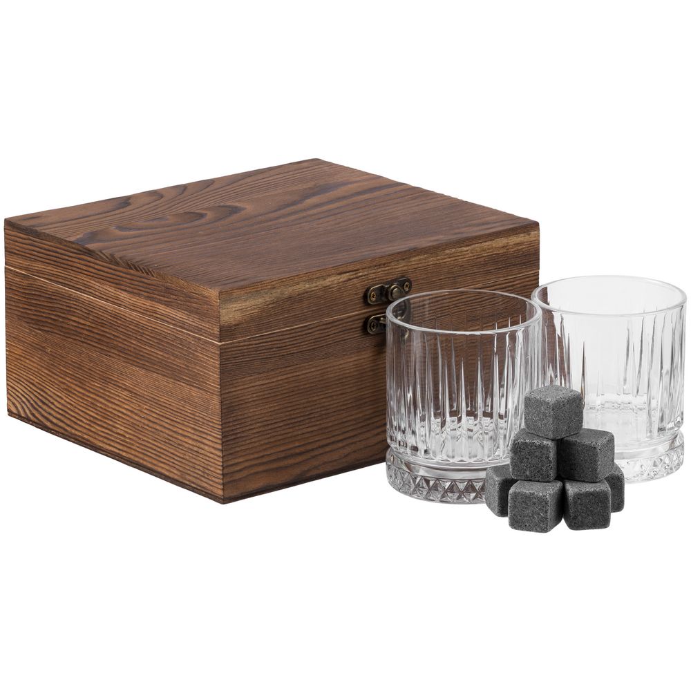 На подарочной упаковке допускаются незначительные визуальные дефекты и неплотное примыкание крышки.В наборе: 2 стакана (210 мл) и 8 камней для виски. Поставляется в деревянной подарочной коробке и индивидуальной транспортной коробке из белого картона.