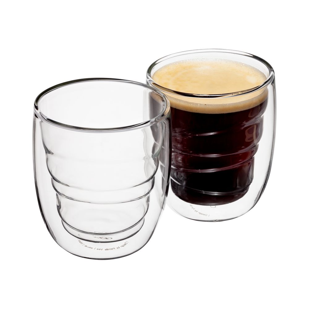 Набор Elements Wood — это оригинальные стаканы с двойными стенками и структурным дизайном. Выполнены из боросиликатного стекла, устойчивого к царапинам и перепадам температур. Гладкая внешняя стенка позволяет держать стакан с горячим содержимым в руке без риска обжечься, а рельефная внутренняя часть придает напиткам необычный вид.